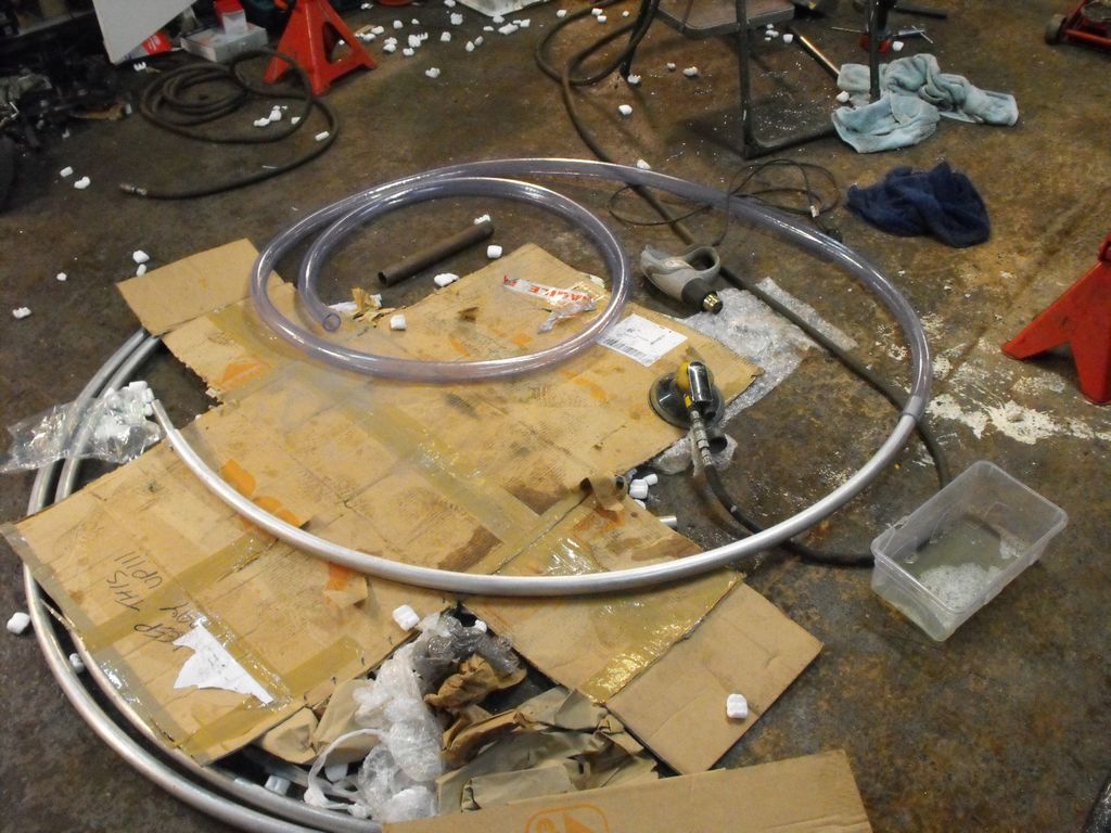 Putting the outer PVC hose on is a bit of a trial! I also had to sand the marks from the square formers used for rolling, hence the DA sander is out! I used heat and soapy water as well as attaching the hose to the air line and blocking off the other end of the wheel section. This was meant to create a cushion of air to ease fitting the hose, but the hose is a pretty tough nut to crack. Besides, it becomes hard on a large section to apply force the hose whilst steadying the wheel tube. In the end I did two pieces of hose (one from each end) on the sections of the first wheel! Trying to do it in one piece just wasn’t happening!